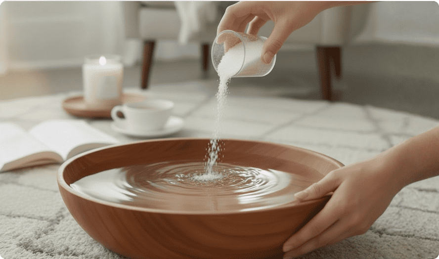 - Add 1/2 small tea cup of Epsom salt to the warm water in a standard plastic bath bucket.
