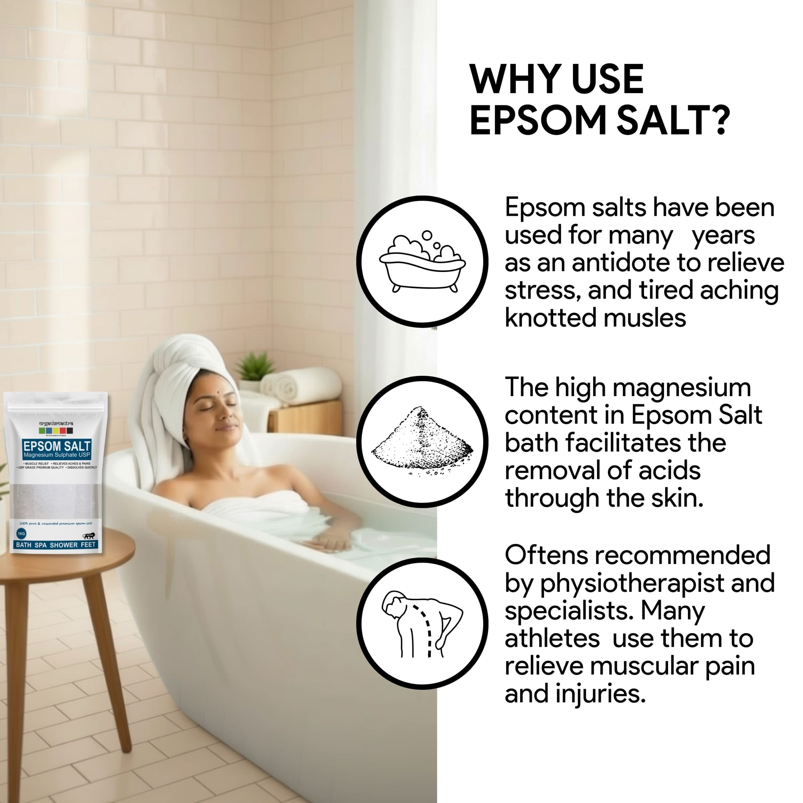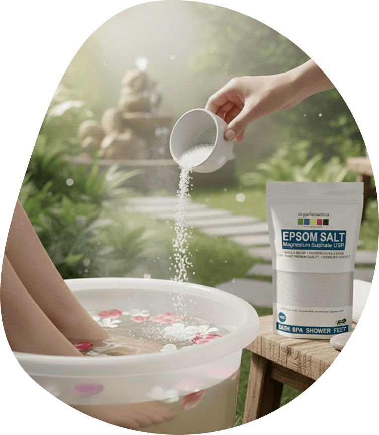 Magnesium is a trace mineral and required in small quantities in our body. Once Epsom Salt is dissolved in water, it releases magnesium and sulfate ion, which are then absorbed in your body through pores.