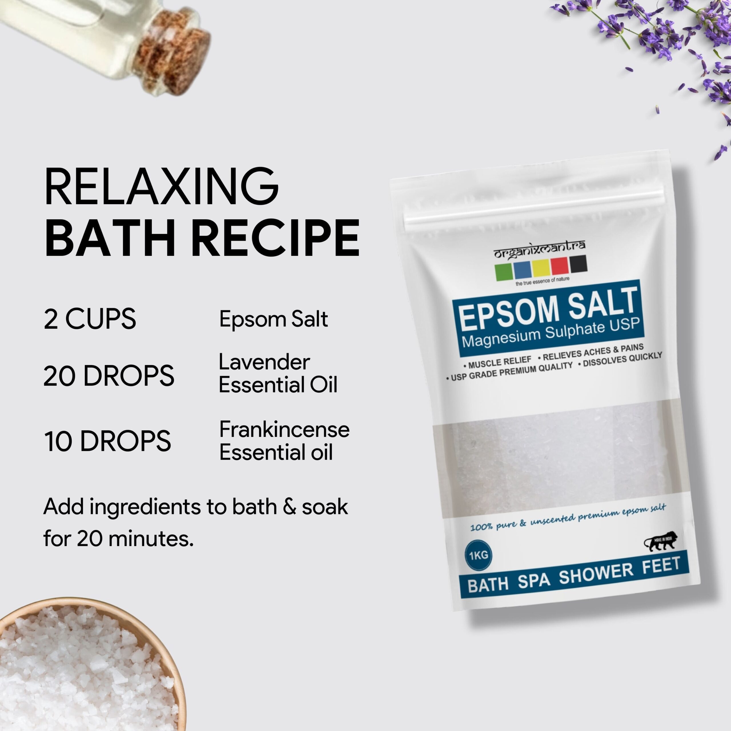 Often Essential Oils, dried flower petals, Himalayan Pink Salt are added to Epsom Salt for added benefits. Essential oils generally used are Lavender, Peppermint, for their aromatherapeutic uses. Lavender helps to de-stress and Peppermint acts as a refresher, and helps in muscle spasm and pain.
