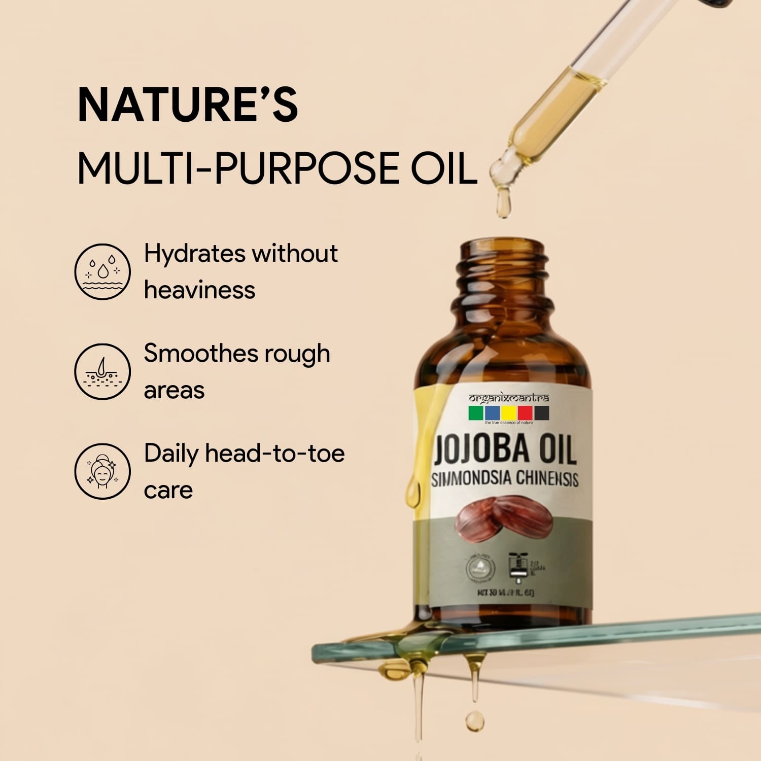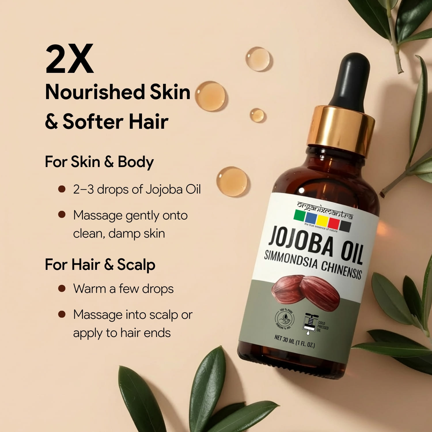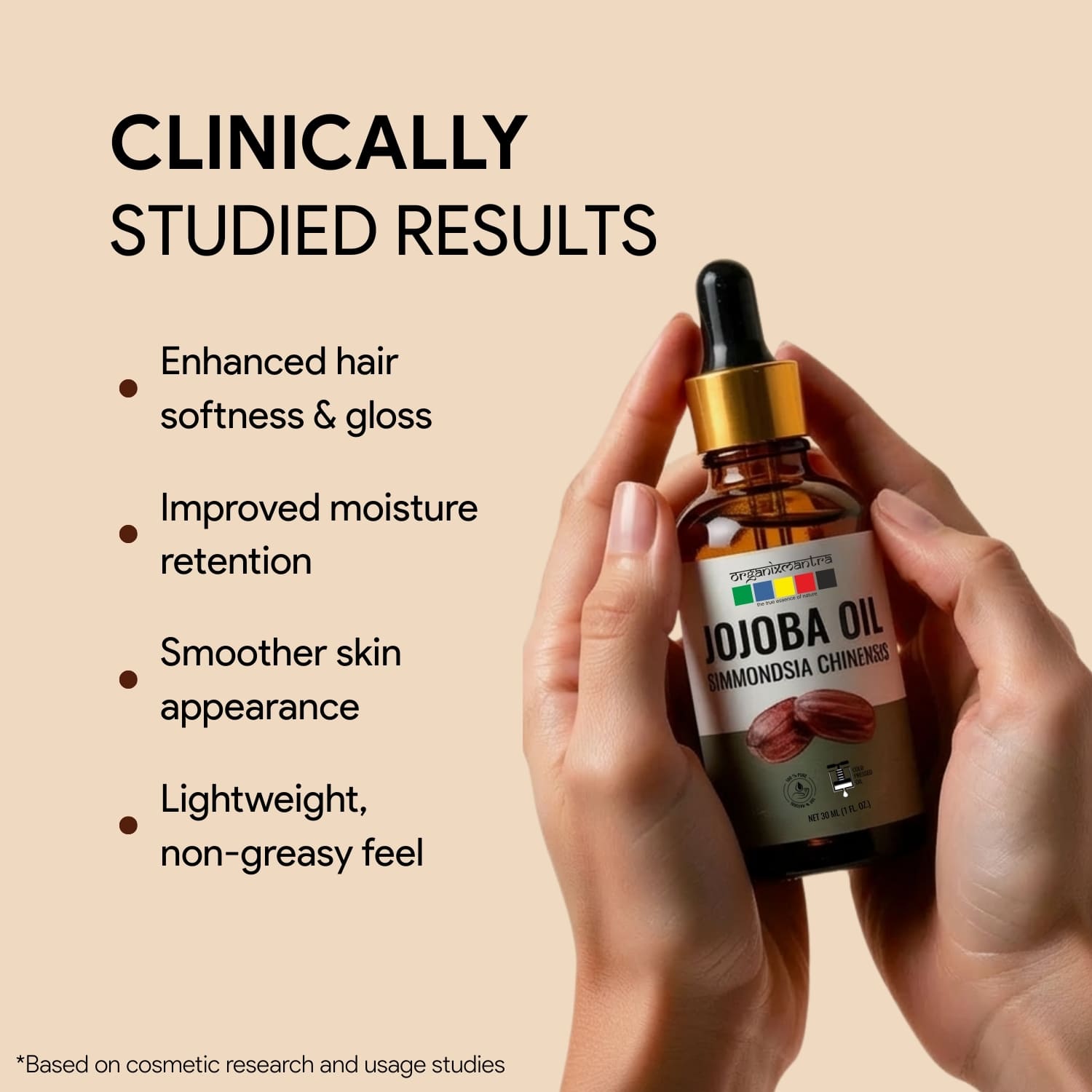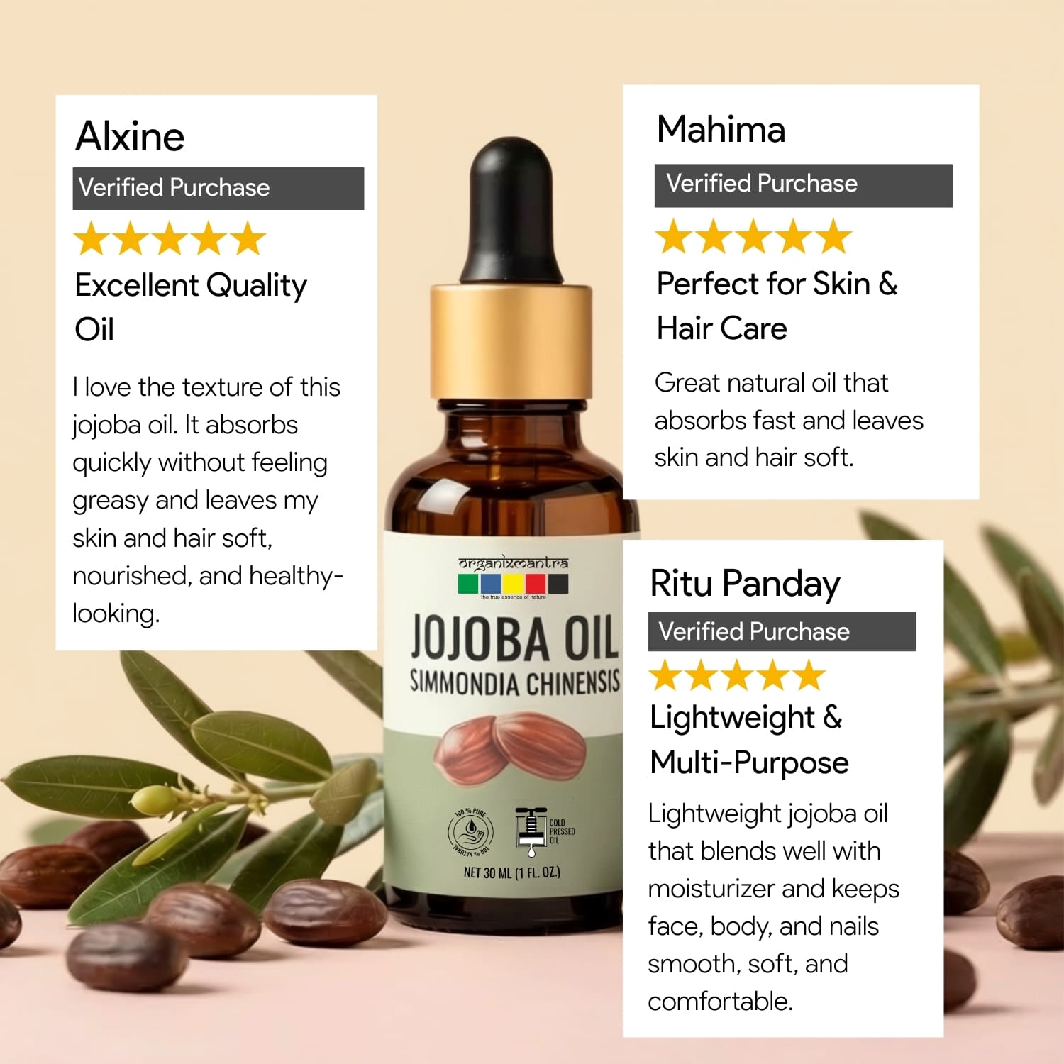 Ingredients: Jojoba Carrier Oil is extracted using Cold pressed process from seeds of the plant botanically known as Simmondsia chinensis.