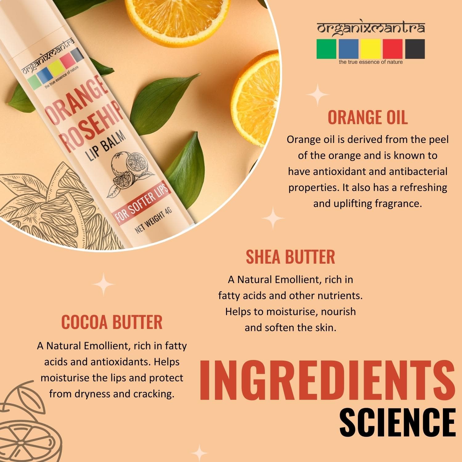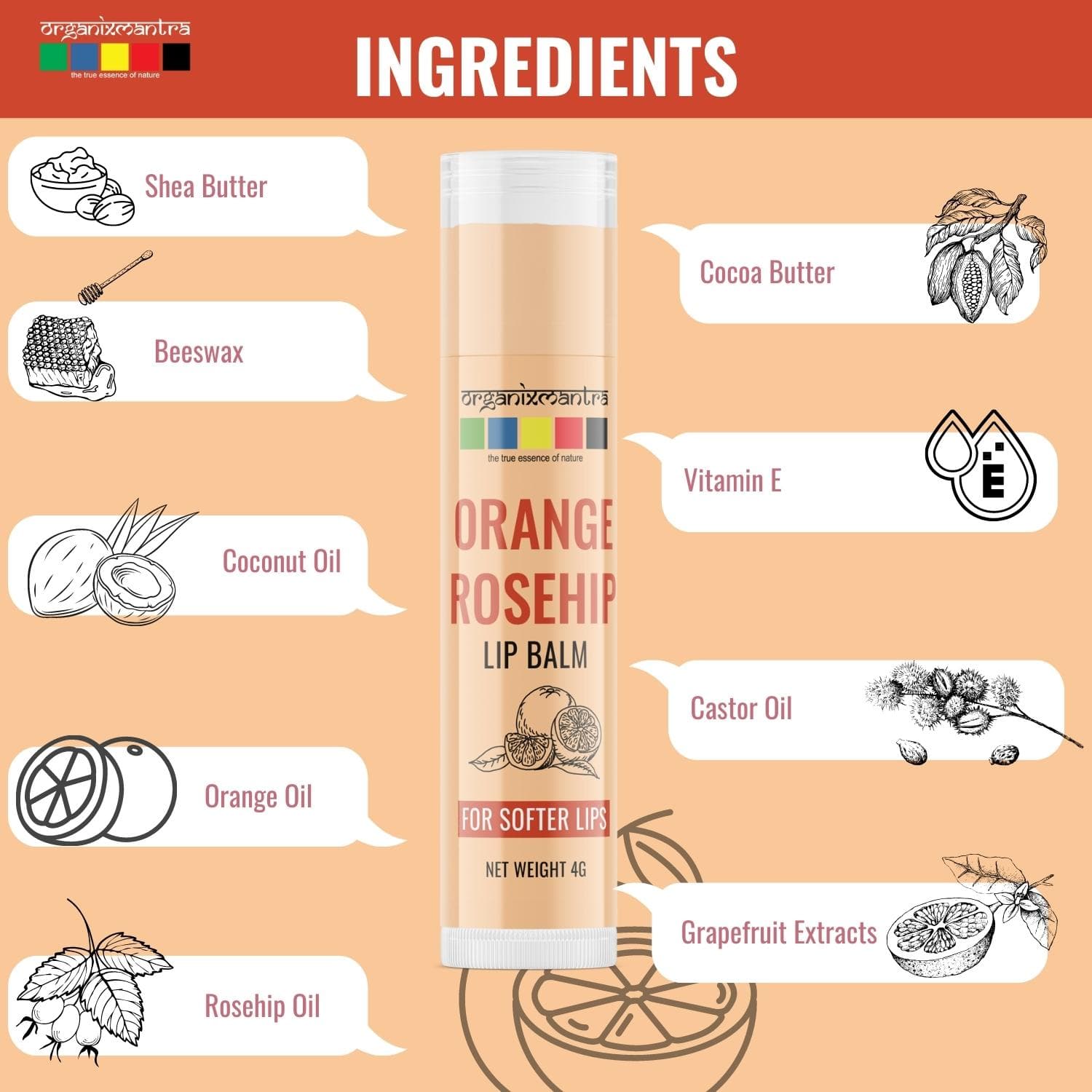 - NATURAL ANTIOXIDANT FOR LIPS: The Orange Rosehip Organic Lip Balm with Vitamin E and Grapefruit Extracts acts as an antioxidant that is known to help protect the lips from oxidative stress and environmental damage.