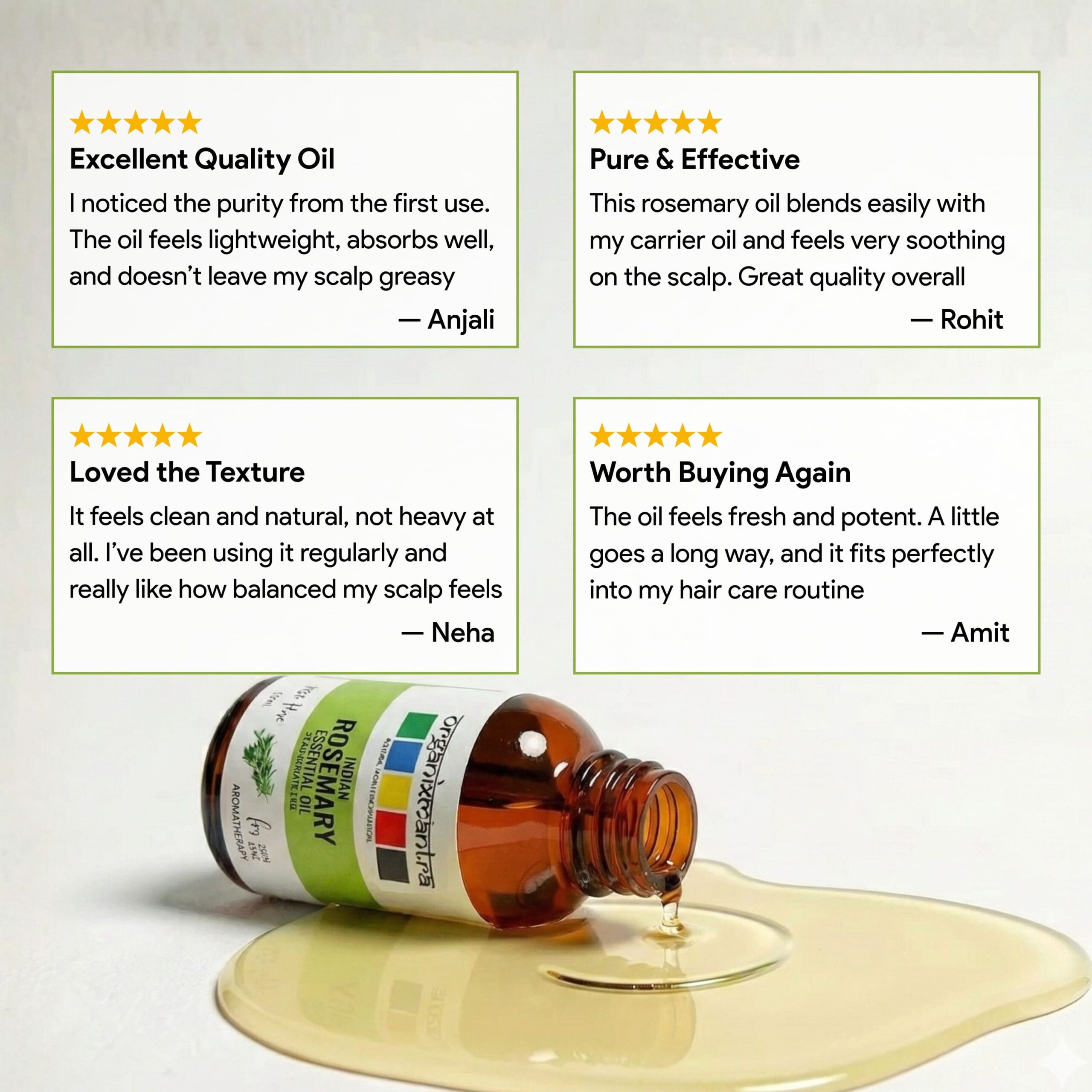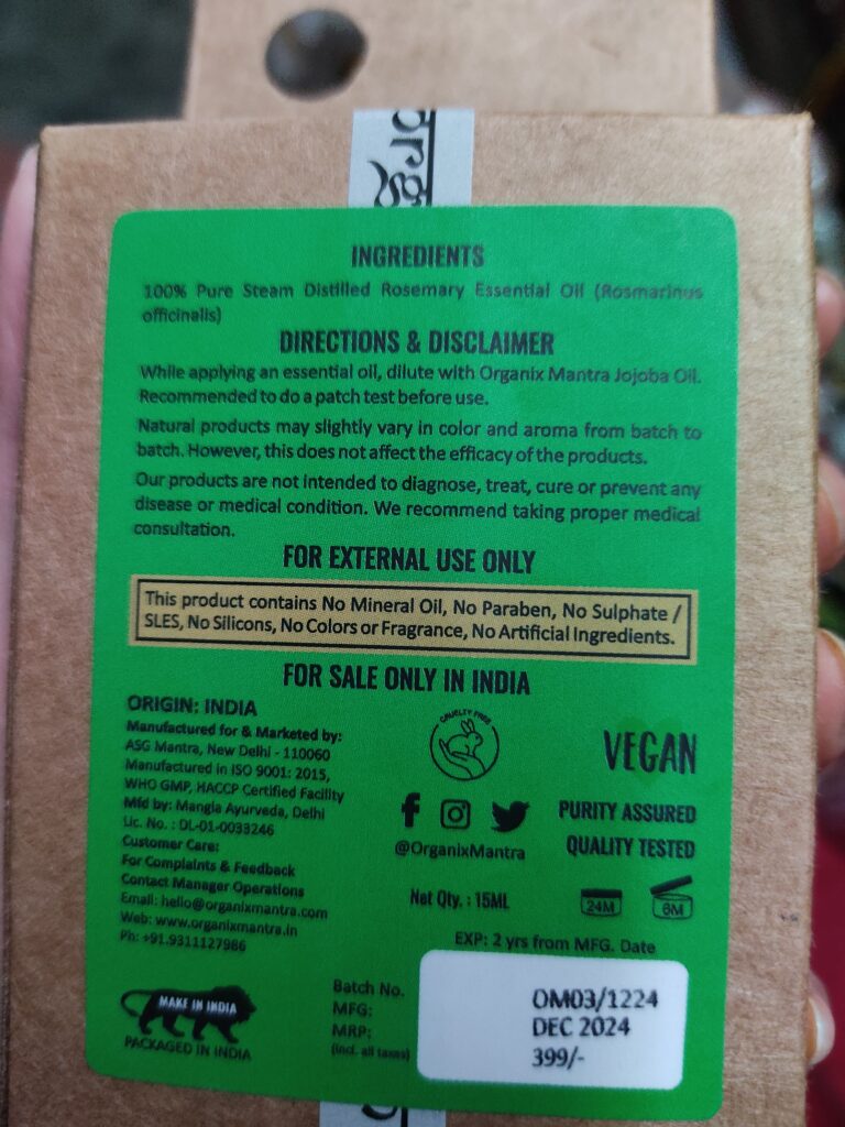 Organix Mantra Rosemary Oil is 100% pure, undiluted, and natural. Free from adulterants, or additives.