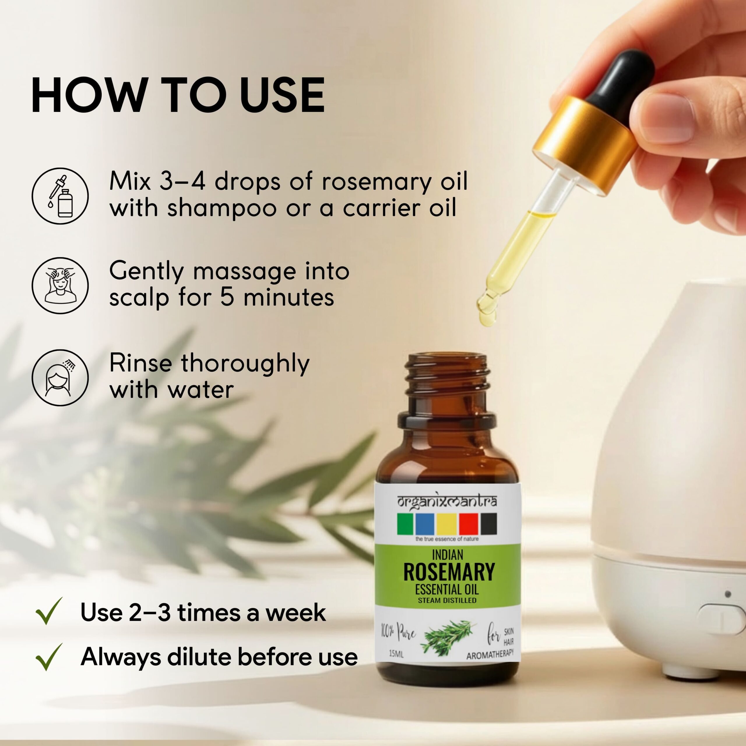 - Leave a diffuser containing a few drops of rosemary oil in your office or home. The aroma is known to be a natural mind soother. Helps to improve the alertness of the mind.