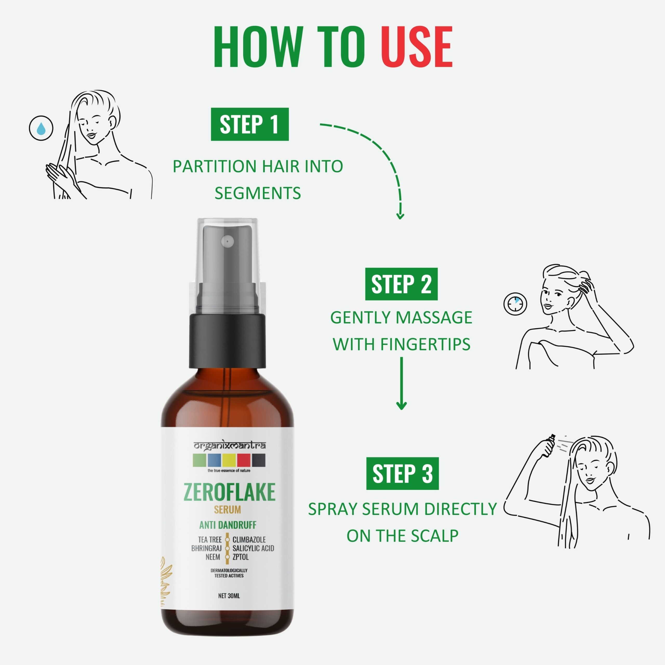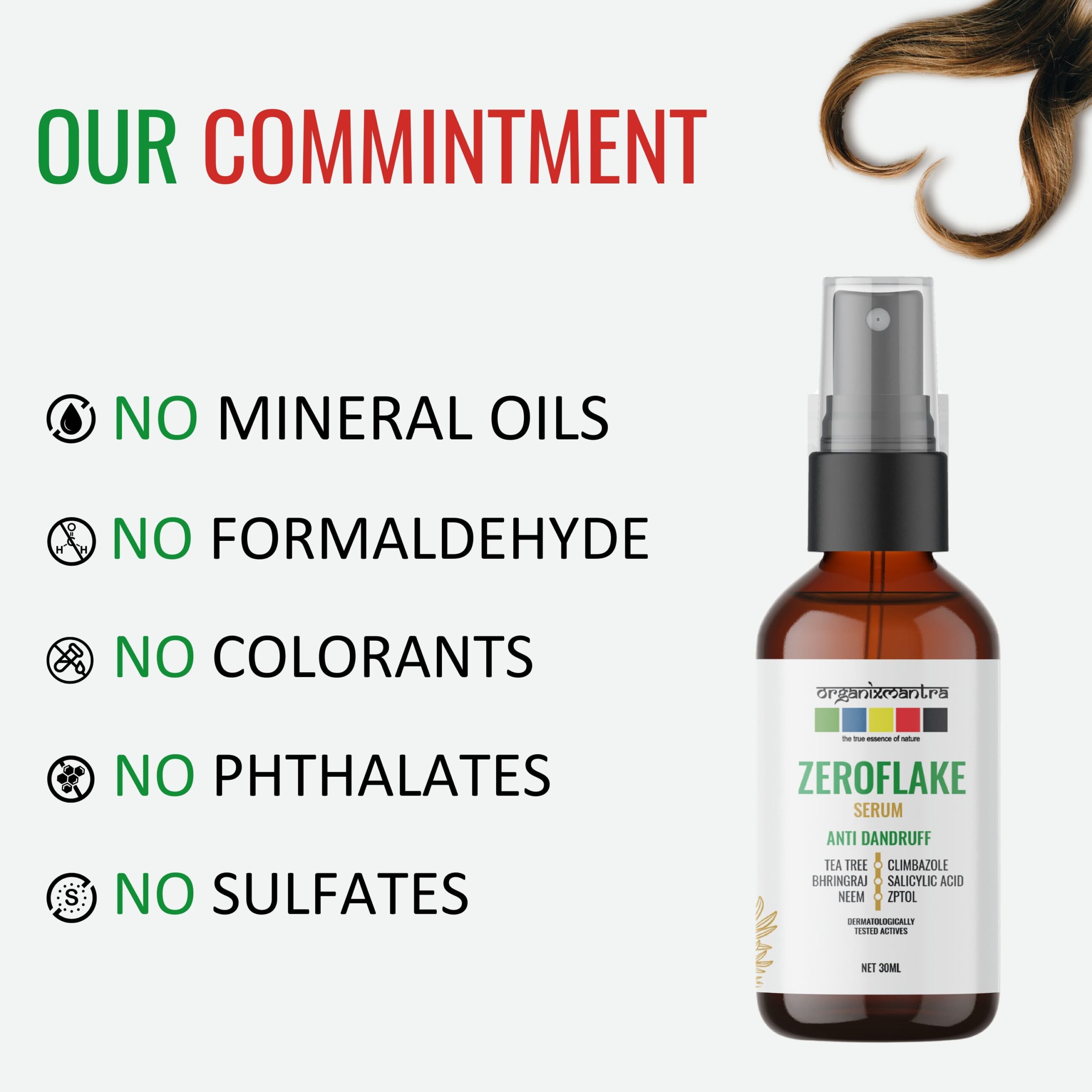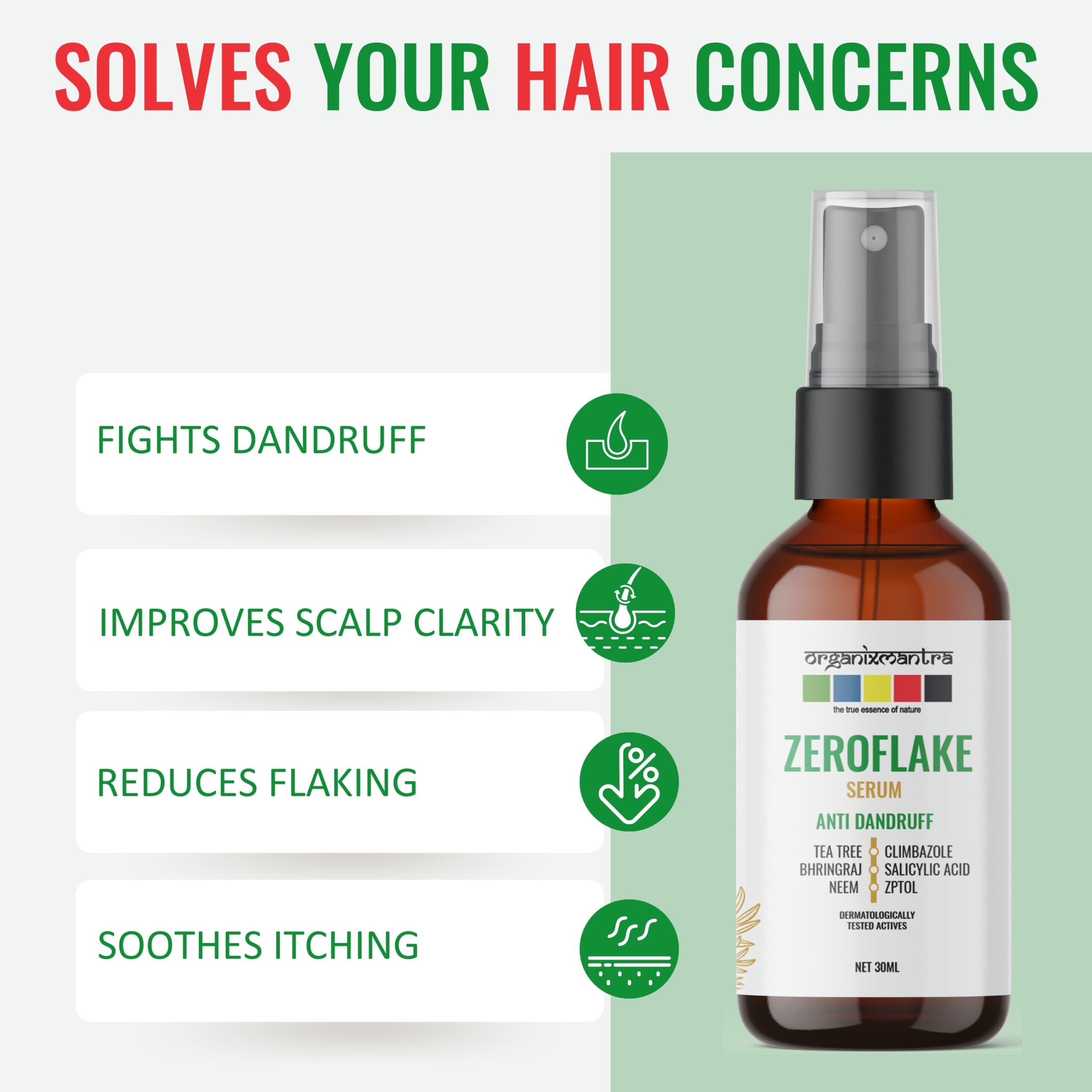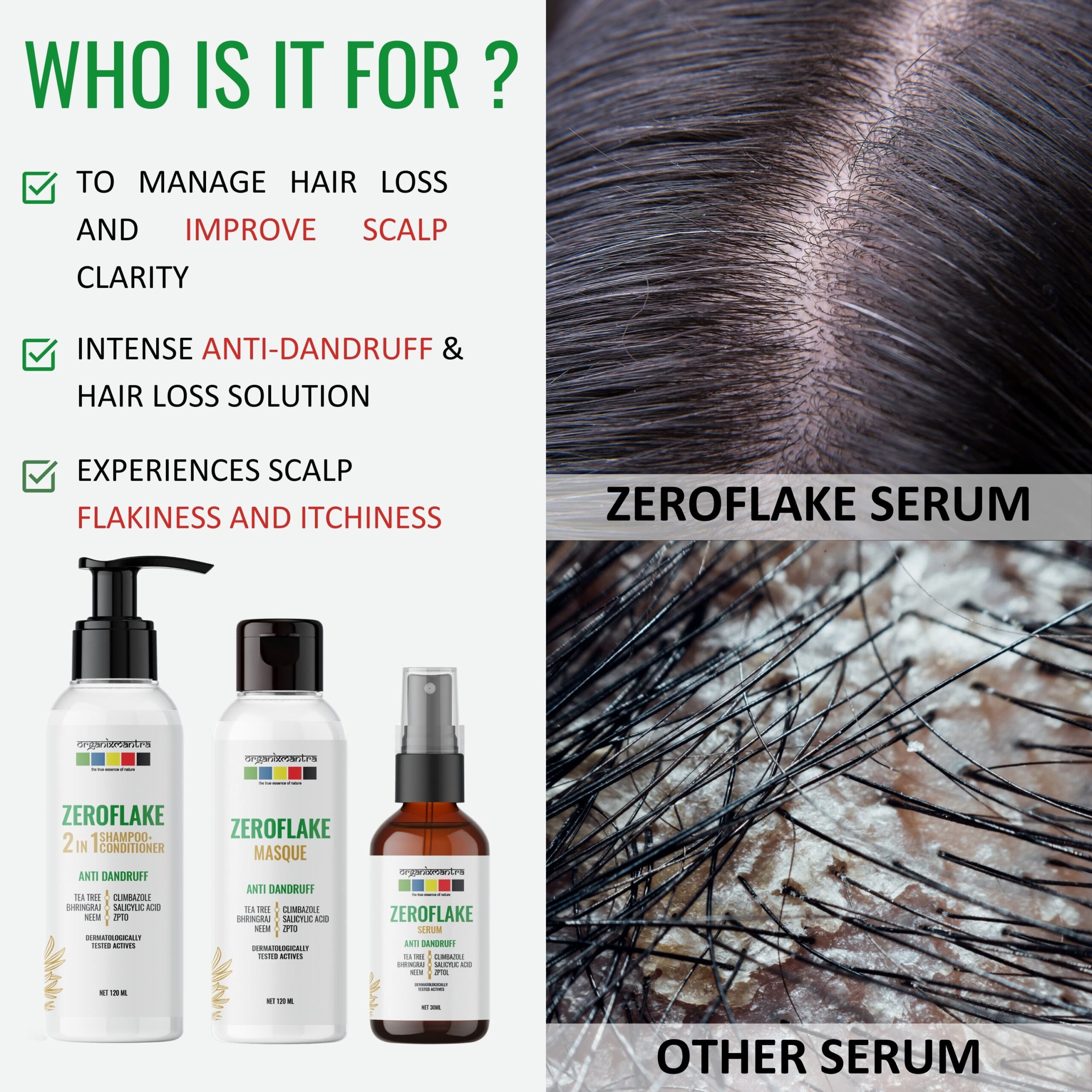 • ADVANCED ANTI-DANDRUFF FORMULA : Organix Mantra ZeroFlake Hair Serum, with Zinc Pyrithione, Climbazole, Salicylic Acid, Tea Tree Oil, Neem Extract, and Bringraj, combats dandruff and soothes, exfoliates, and hydrates for a healthy scalp.